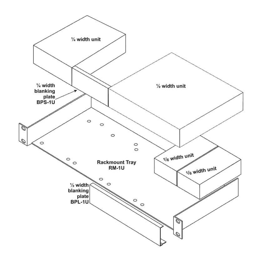 The RM-1U is a single-unit rack-mounting tray which will take up to four Ampetronic devices, depending on width, or blanking plates. The BPS-1U Short blanking plate takes up one quarter of the width. The BPL-1U Long blanking plate takes up half of the width. Loop drivers and other accessories can be fitted up to the total width. Blanking plates should be ordered to fill gaps.