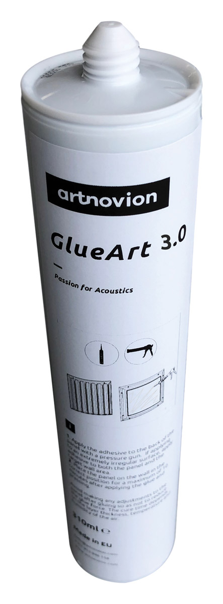 GlueArt 3.0 is a polymer-based glue specifically designed by Artnovion to bond to acoustic foam, PET, and EPS. It is applicable to a vast range of surfaces, including cement, painted surfaces, stone, wallpaper, plasterboard, wood, chipboard, PVC, expanded plastic, mineral fibres, and metal.