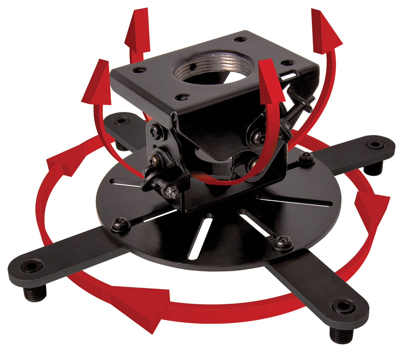 B-Tech BT899XL has the same properties as BT899 however it is designed for extra-large projectors that require up to 493mm between fixings. The mount can be used with projectors with M2,.5, M3, M4, M5, or M6 fixings. The mount is fixed to the ceiling via a pivoting plate that allows tilting through 90 degrees. BT899XL is also available as flush fitting, and with adjustable drop as BT899XL-AD. The included locking screws can be used for additional security. Mounting hardware is included.