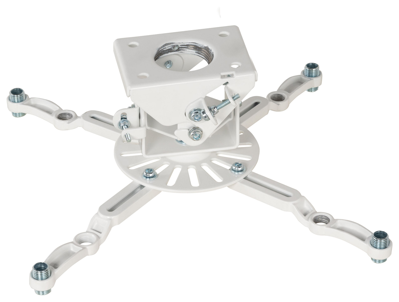 BT893-AD is a heavy duty ceiling mount with adjustable drop range for projector weighing up to 70kg. A distance between fixings of 873mm (maximum), or 618mm maximum in a square fixing pattern can be extended using optional extension legs. BT893-AD can be used with projectors with M6, M8, M10 or M12 fixings. The mount can be fixed directly to the ceiling or 50mm diameter pole, and micro-adjustment thumbwheels allow for precise setup at four points. Available with various fixed drop lengths as BT893-FD, and as flush mount version as BT893.