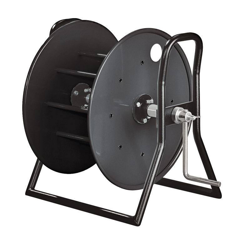 This range of robust cable-drums all have steel drums, with steel tube frames incorporating two carrying handles. All have a friction drum-brake incorporated into the frame to prevent movement in transit. The drums are available with two different styles of side flange - plain or with cable tail supports. The core of the drum is formed from a number of steel bars welded between the flanges.