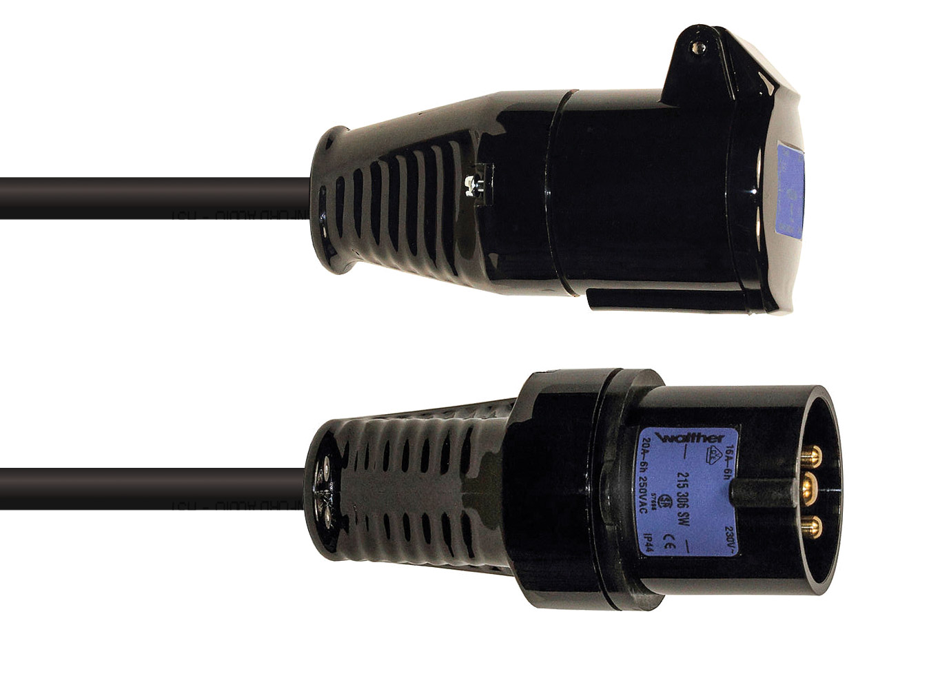 These 16 Amp cables have a Walther 310306SW 16 Amp black cable socket and a Walther 210306SW 16 Amp black cable plug, and use 2.5mm² (20 Amp rated) cable with a black rubber jacket.