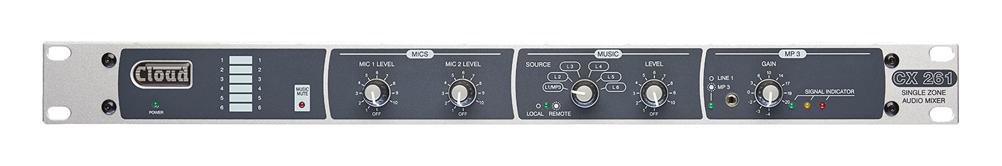 The Cloud CX261 is a 1U rack-mounting, stereo, audio mixer intended for use in commercial audio systems where simple control of background music needs to be combined with a flexible range of paging options. It will mix one of six unbalanced stereo line inputs with up to two balanced microphone inputs.