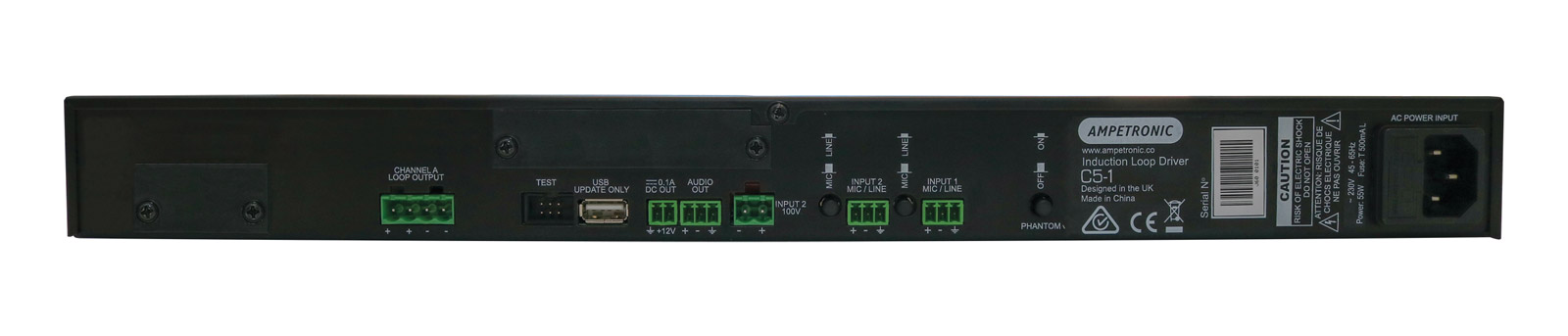 The rear facing panel host all input and output connectivity including inputs via 3-way 3.5mm Euroblock screw terminals, switchable mic/line level; 100V line input via 2-way 5mm Euroblock screw terminal, loop connectors via 4-way 5mm Euroblock terminals, DC output via 2-way 3.5mm Euroblock terminal, and line output via 3-way 3.5mm Euroblock screw terminals. 230V AC, 45-65Hz power input is by way of 3-pin IEC connection. A latching phantom power switch allows the user to apply 24V to both inputs of the amplifier. A USB input can be used for firmware updates or to power an external wireless router with a limit of 200mA current. Networkable models have an RJ45 Ethernet connection for connecting to LAN or external wireless router. Dante models have an RJ45 for Dante network connection.