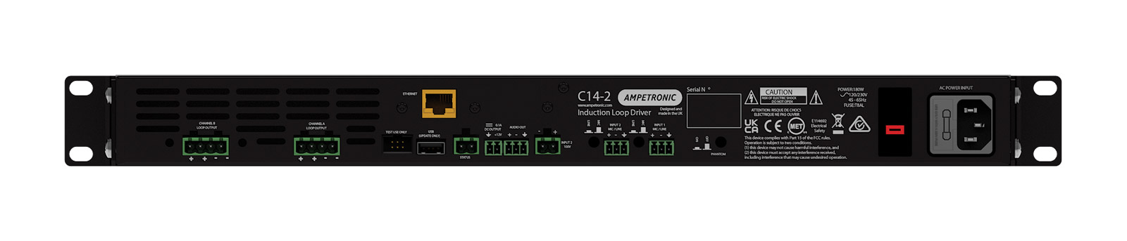 Ampetronic C series hearing loop amplifiers have been designed with Class D drivers to aid ‘low running and maintenance costs’ in locations such as lecture theatres, conferencing facilities, stadia, sports halls, cinemas, theatres, court rooms and transport stations. C5, C7, and C10 amplifiers are available in single loop or multi-loop configuration and have been optimised for ‘speech frequencies’ along with ‘musical reproduction’, whilst C14 amplifiers are available as multi-loop drivers only. All power options are available with network options and/or Dante compatibility.
