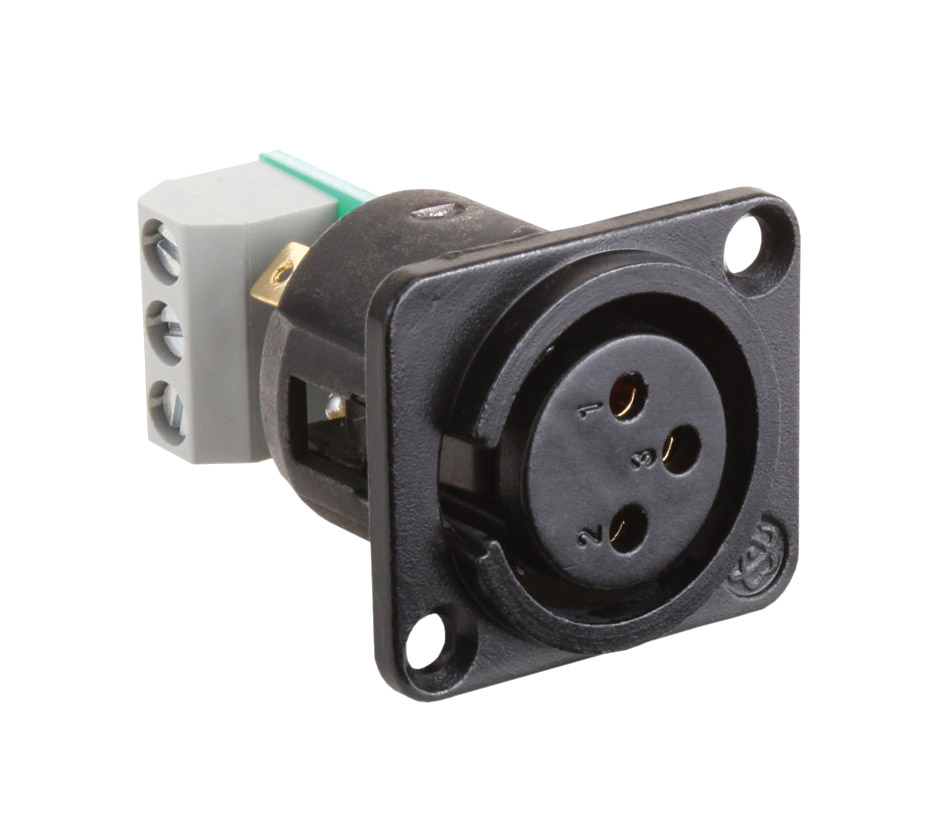 Male 3-pin XLR connector with switch-selectable audio attenuation of unity or 50dB. Also features protections from up to 55 Vdc Phantom power. Has terminal block connections.
