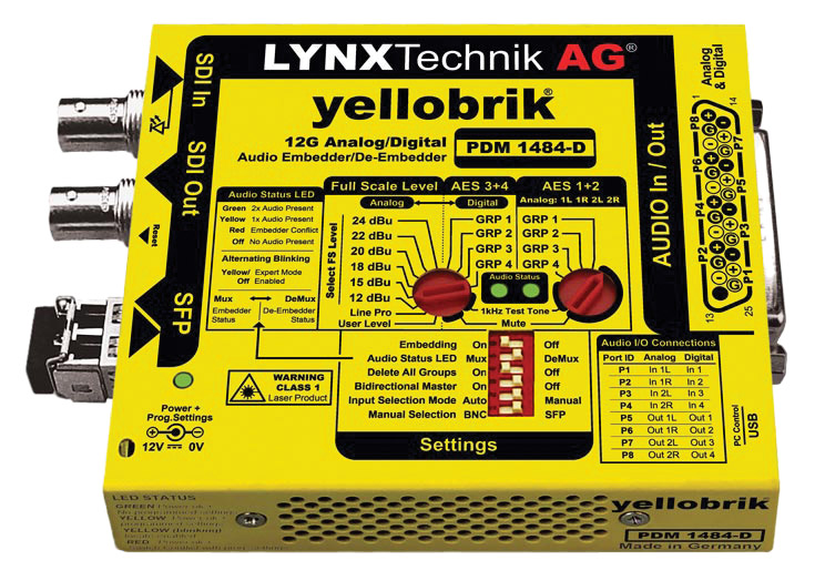 LYNX YELLOBRIK PDM 1284-B AUDIO EMBEDDER AND DEEMBEDDER Unbalanced AES on BNC, 3GLYNX YELLOBRIK PDM 1284-D AUDIO EMBEDDER AND DEEMBEDDER Balanced AES on D-sub-25, 3GLYNX YELLOBRIK PDM 1383 AUDIO EMBEDDER AND DEEMBEDDER Balanced analogue on D-sub-25, 3GLYNX YELLOBRIK PDM 1484-D AUDIO EMBEDDER AND DEEMBEDDER AES/analogue on D-sub-25, 12G