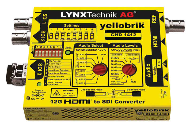 CHD 1412 is a versatile and compact HDMI to SDI converter with integrated frame synchronizer. It has been designed for any application which requires a fully synchronized SDI input from an external asynchronous HDMI source. The flexible reference sync input will accept any analogue video sync format including SD bi-level sync, black burst, colour-bars and tri-level sync. The sync input is auto detecting and fully cross lock compatible - for example: an SDTV reference can be used to frequency lock a HD HDMI input. If no reference is present, the converter performs a standard asynchronous HDMI to SDI conversion. It can also lock to the HDMI input. A pair of stereo analogue inputs can be embedded into any AES channel. Audio inputs can be either balanced audio with selectable full scale level, or unbalanced consumer line level audio. Currently, PCM and AC3 audio present in HDMI stream are transparently passed through/embedded in self-lock mode. The module is also compatible with LynxCentraal and yelloGUI software packages, which provide access to a host of additional internal settings including adjustable video delay for timing purposes. An SDI fibre output is also provided with a variety of plug in SFP options available. Power source: 12V DC, 10W nominal; supports 10-24V DC input range. Dimensions (WxDxH): 140 x 90 x 22mm. Weight: 207g