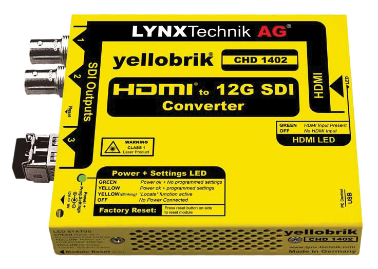 CHD 1402 is a compact HDMI to SDI converter. It has been designed as a solution for any application which requires a broadcast quality SDI signal derived from an external HDMI source. Currently only PCM audio present in the HDMI stream will be embedded into the corresponding channels on the SDI output. The module is also compatible with the yelloGUI and LynxCentraal control software, which provides access to additional internal settings. An SDI fibre output is also provided with a selection of optional SFPs.