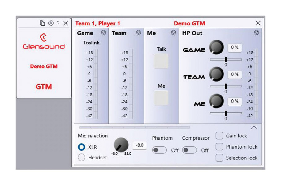 The top panel of the GTM and GTM SI has three ‘large’ level controls for the user to adjust their individual mix into their headphones. The mixable sources are ‘GAME’, a stereo output of the game audio; ‘TEAM’, an overall level of the team comms channel; and ‘ME’, an output of the user’s own voice in their headphones. Each controller has a multicoloured LED ring around it to indicate the level position.