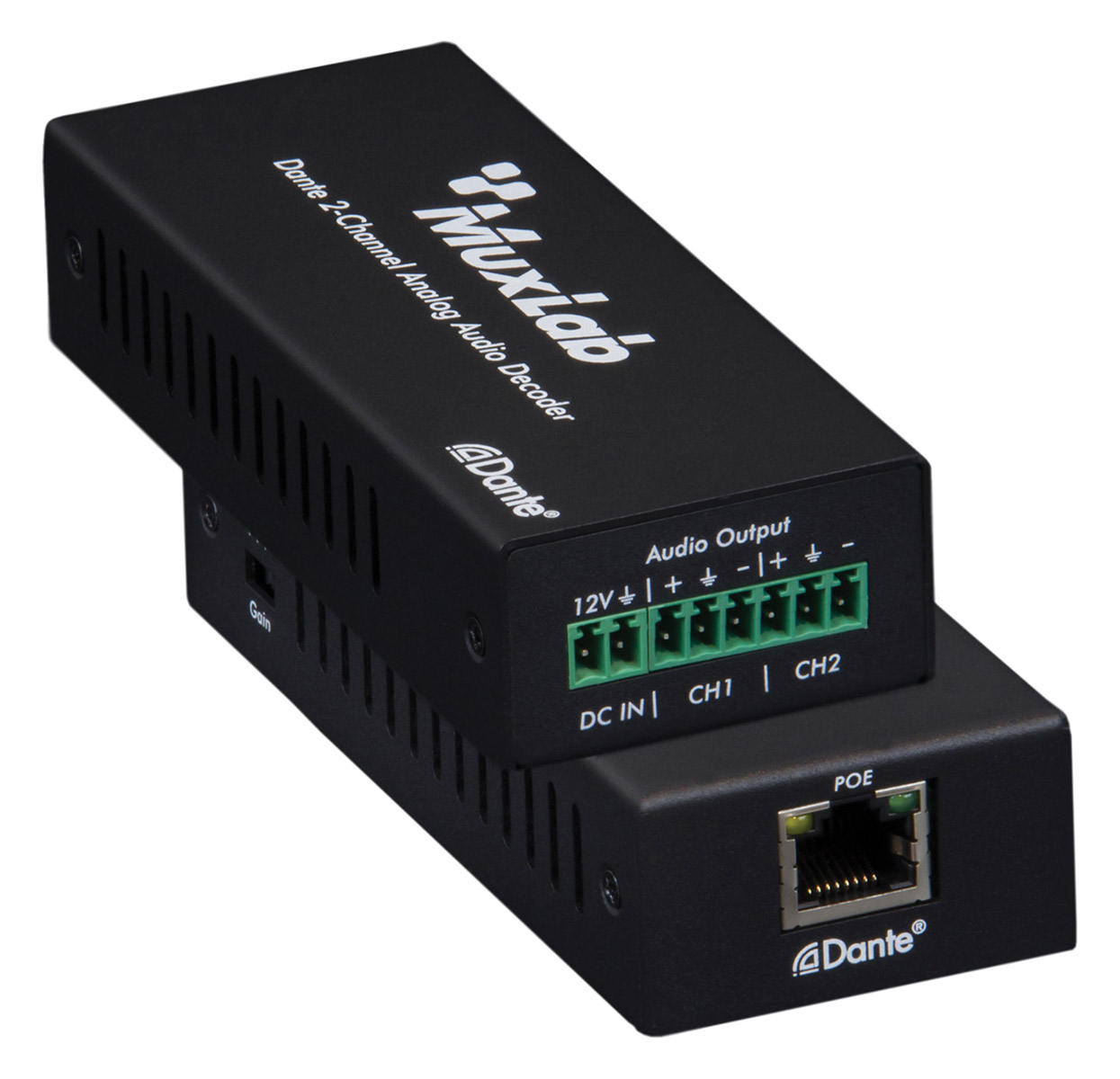 Muxlab Dante converters offer a gateway from or to digital audio equipment using Dante protocol. This selection of interfaces have been designed for studios, corporate offices, and broadcast where an audio signal can be better controlled over IP network and interfacing.