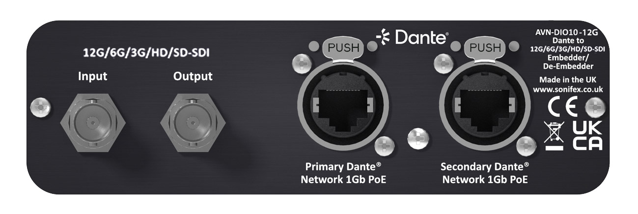 SONIFEX AVN-DIO10-12G AUDIO INTERFACE Dante, PoE powered, 64-channel, 12G/6G/3G/HD/SD-SDI I/O Artikelnummer: 95-5950