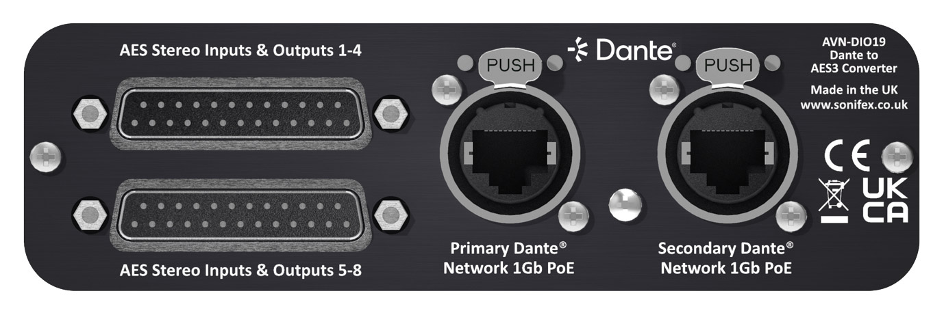 DIO19 allows the I/O and conversion of Dante and AES3 audio signals. Eight balanced AES3 stereo inputs and outputs are provided by way of dual 25-way D-sub connectors, whilst Dante primary and secondary connections are provided via EthernCON. Dante sample rates include 44.1kHz, 48kHz, 88.2kHz, and 96kHz, with PCM16/24/32 encoding.