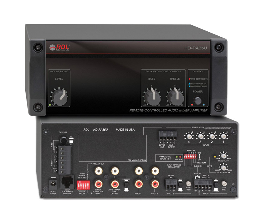 RDL HD-PA35 POWER AMPLIFIER 35W, 4/8 Ohm, single channel, 1x dual RCA (phono)/terminalRDL HD-MA35 MIXER AMPLIFIER 35W, 4/8 Ohm, 3-channel, 2x dual RCA (phono), 1x terminalRDL HD-MA35U MIXER AMPLIFIER 35W, 4/8 Ohm, 4-channel, 2x dual RCA (phono), 2x terminalRDL HD-MA35UA MIXER AMPLIFIER 35W, 25/70/100V, 4-channel, 2x dual RCA (phono), 2x terminalRDL HD-RA35U REMOTE MIXER AMPLIFIER 35W, 4/8 Ohm, 4-channel, 2x dual RCA (phono), 2x terminalRDL HD-RA2 RACK ADAPTER 19-inch, for 2x HD series amplifiers, 2URDL HD-WM2 MOUNTING BRACKET Wall-mount, for 1x HD series amplifier without n model numberRDL RC-PS5 RACKMOUNT TRAY For 5x PS-24V3, 1U