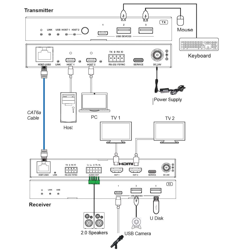 The transmitter features two USB-C selectable host ports, three local input via single USB-C and two USB-A connections, one FSYNC GPIO input, and a single RS-232 passthrough. The receiver features one USB-C and two USB-A outputs, two HDMI output ports, one FSYNC GPIO output, and one RS-232 pass through. The device also supports 24V Bi-directional PoC.