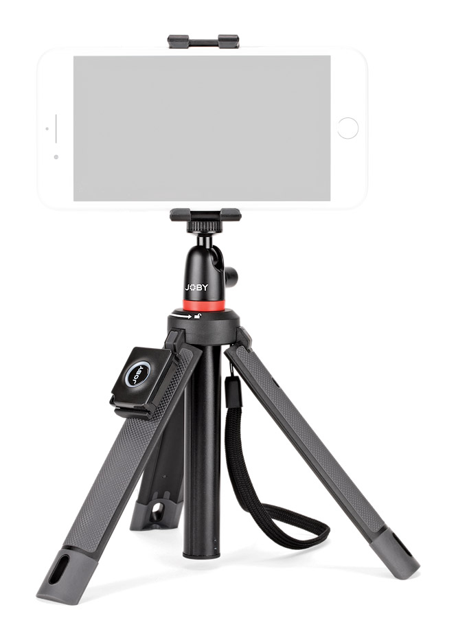 Joby Telepod Mobile is essentially a Telepod 325 with Ballhead 1K, Griptight One phone mount, Pin Joint mount, and Impulse Bluetooth trigger. The Bluetooth remote attaches to one of the legs of the tripod and allows the user to remotely activate the compatible camera's shutter. The Bluetooth trigger can also be detached from the tripod for further remote use.