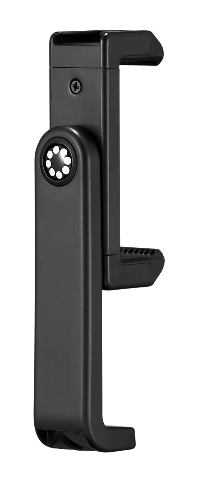 An adjustable smartphone holder with double cold shoe and 1/4-inch thread mount. This mount enables the user to mount a mobile device measuring up to 8.8cm wide and 2cm depth, to a tripod stand, and add an accessory such as the Beamo Mini LED or Wavo Air wireless microphone receiver to the secondary cold shoe mount.