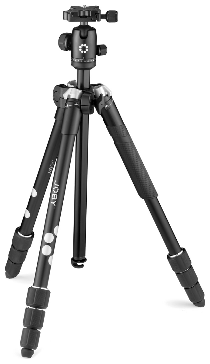 A 4-section tripod with a safety load capacity of 8kg, and therefore able to support mirrorless and most DSLR cameras. The telescopic legs are released and locked into place by using Joby's M'lock twist-lock system. The tripod is manufactured from aluminium and weighs 1.69kg. A detachable hook at the bottom of the centre column allows the user to hang a camera bag or ballast for additional stability. The legs can be set to angles of 25-degrees or 35-degrees. An Arca-Swiss compatible quick release plate is positioned on top of a ball head which has a 360-degree pan and -38/+90-degree tilt, and is locked into position with dual thumb screws. Dual bubble levels aid horizontal and vertical positioning. An included smartphone clamp allows the connection of devices measuring 60-140mm.