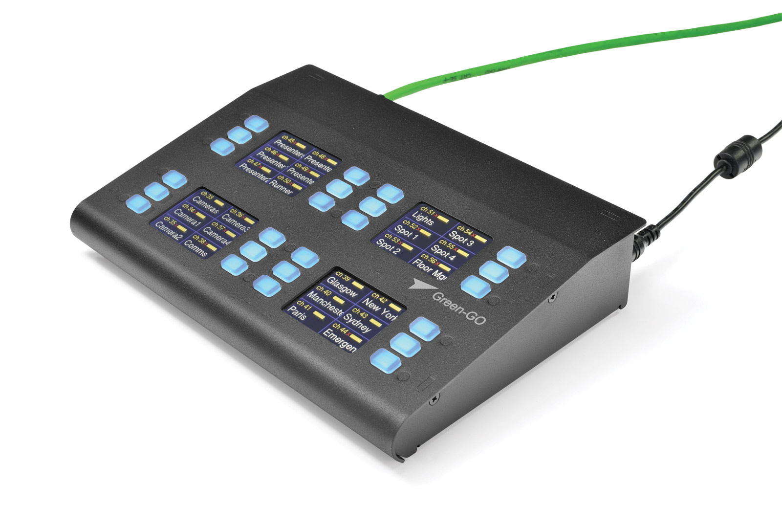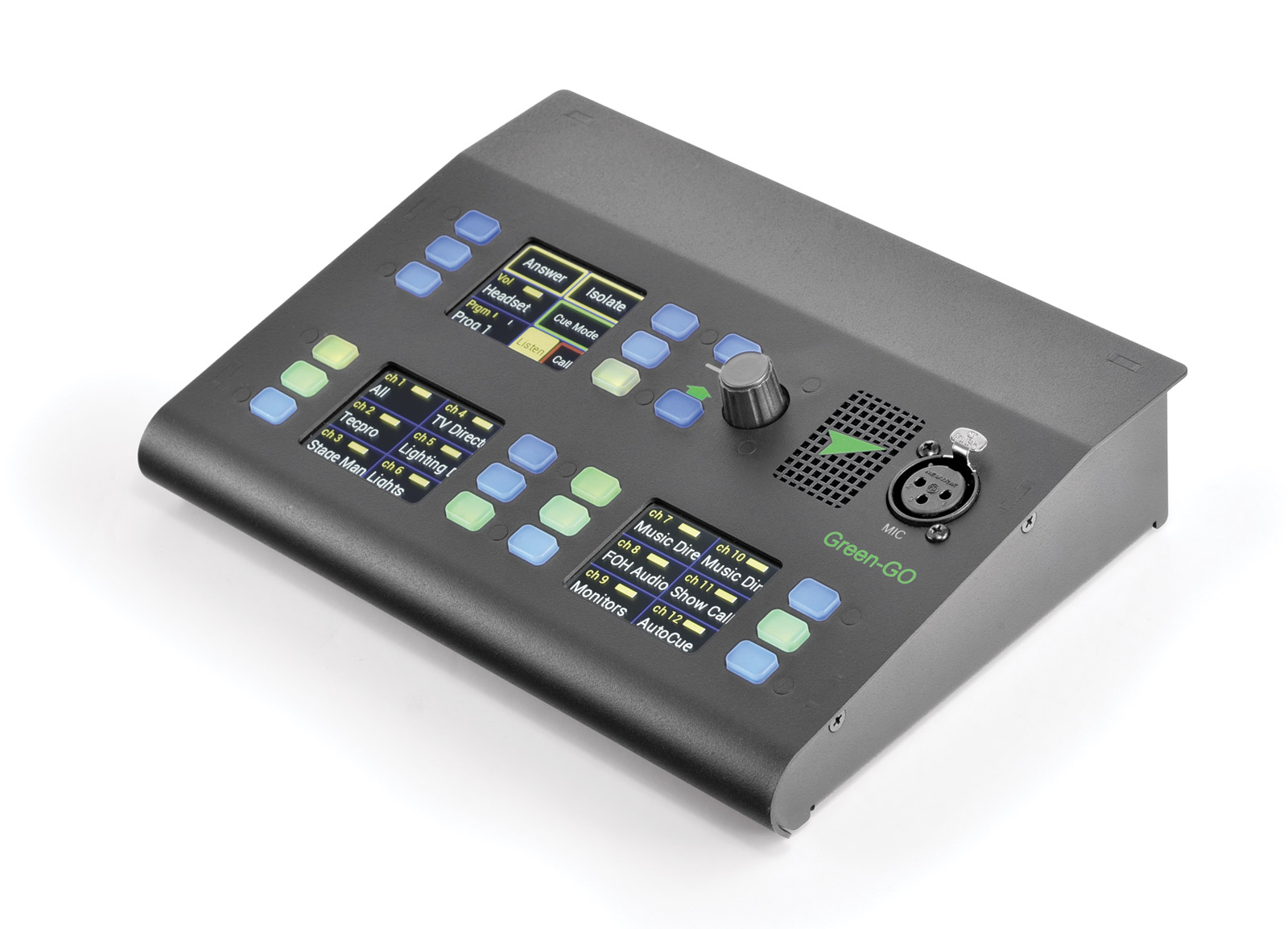 Intercom channels are presented in banks of six and each channel is controlled by a combination of an microphone on/off switch with LED and a TFT touch screen. The LED switches offer latching and non-latching modes, depending on the duration for which they are pressed. Each microphone switch illuminates orange, green or red (blinking) to indicate talk to the channel, talkback from the channel or 'Call' signal received. The TFT touch screen controls several functions including channel 'Listen/Mute', 'Call' (to a group or individual) and 'Cue' mode.