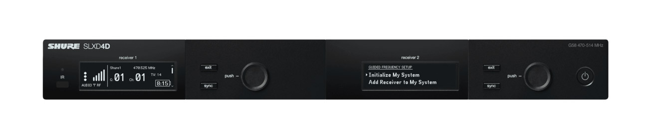 The front facing panel of the SLXD4 receiver has all status identifying tools including a flashing/solid LED for sync status, and visual display showing both receiver and linked transmitter settings along with menus for adjustment. Power button, control knob, sync and exit buttons are also located on the front facing panel, along with an infrared port for syncing with selected transmitter.