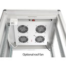 A 'pagoda style' roof sits spaced 10mm above the top frame. This removable roof allows for the fitting or maintenance of a roof-mounted fan-tray without affecting the construction of the cabinet frame or any equipment mounted within the cabinet. On 800mm wide models the roof has an integrated, brush-strip entry-point on each side. The bottom frame includes a large cable-entry point, with an integrated, rubber-edged, sliding-plate to hold cables in place and prevent dust ingress. Racks are supplied fitted with heavy duty castors and include a set of levelling feet, each with a maximum load of 600kg per set of four. Note that castors and levelling feet cannot be used together.