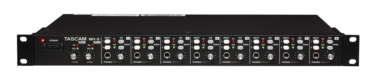 Intended for use in studio and stage installations, the MH-8 has eight stereo output channels, each offering 250 mW of power to left and right channels. Each output channel may be fed from a choice of two global stereo inputs or a direct input dedicated to that channel. The amplifier is a rack-mounting device, taking 1u of rack space.