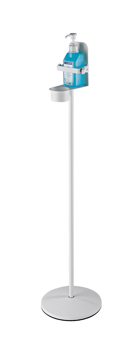This floor standing disinfectant stand has a round base with circumferential rubber ring to prevent slipping or damage to the floor. A tubular steel upright connects the base to the disinfectant holder, which in turn features a removable drip cup. The stand is finished with white powder coat.