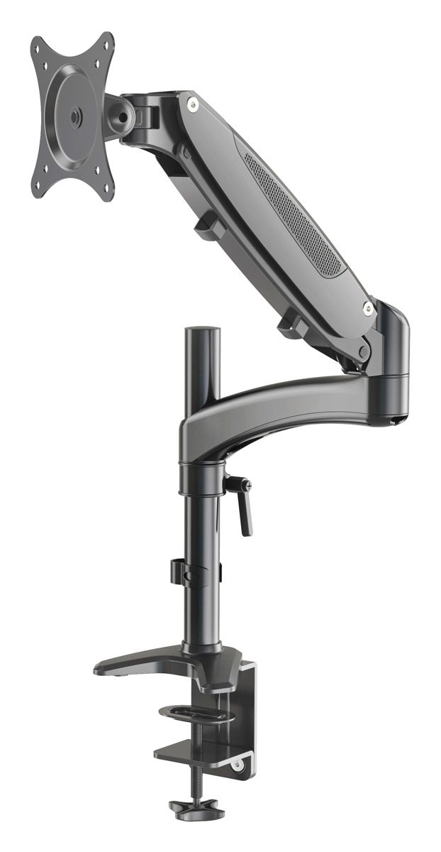 23870 is capable of bearing weights up to 8kg, and screens up to 32-inches on its single arm. Designed for compatibility with VESA 75/75 and VESA 100/100. A pneumatic arm allows the monitor arm to be continuously adjustable arm height of 350mm, with infinite rotation, -90/+85 degree tilt, and 180 degree swivel. The 167mm bracket can be fixed to a wall or flat surface using three screws. Finish: Black. Weight: 1.78kg