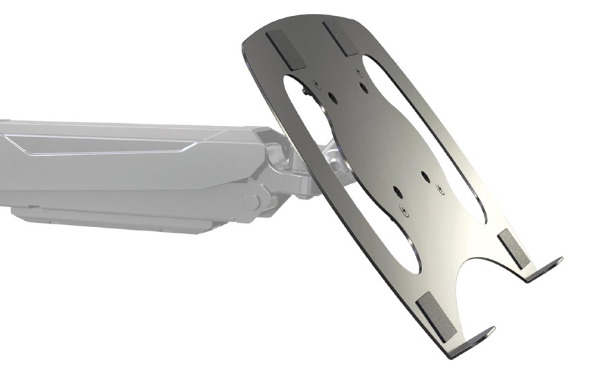 A laptop rest that is designed to attach to VESA 75/75 or VESA 100/100 mounts, such as 23870, 23873, or 23878. The surface area measures 320 x 240mm and is manufactured from steel. Weight: 0.86kg