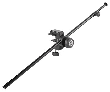Table microphone arm - Fixes onto both flat surfaces and tubes, with a clamping range up to 53mm. A two-piece, telescopic, boom-arm, with an extension range of 560-1020mm, can be angled through 360 degrees and locked in place by a large, knurled, knob. The extendable boom is adjusted in length by a knurled-head screw and topped with a 3/8 inch thread for the connection of microphone clips. Weight 0.76kg. Black finish.