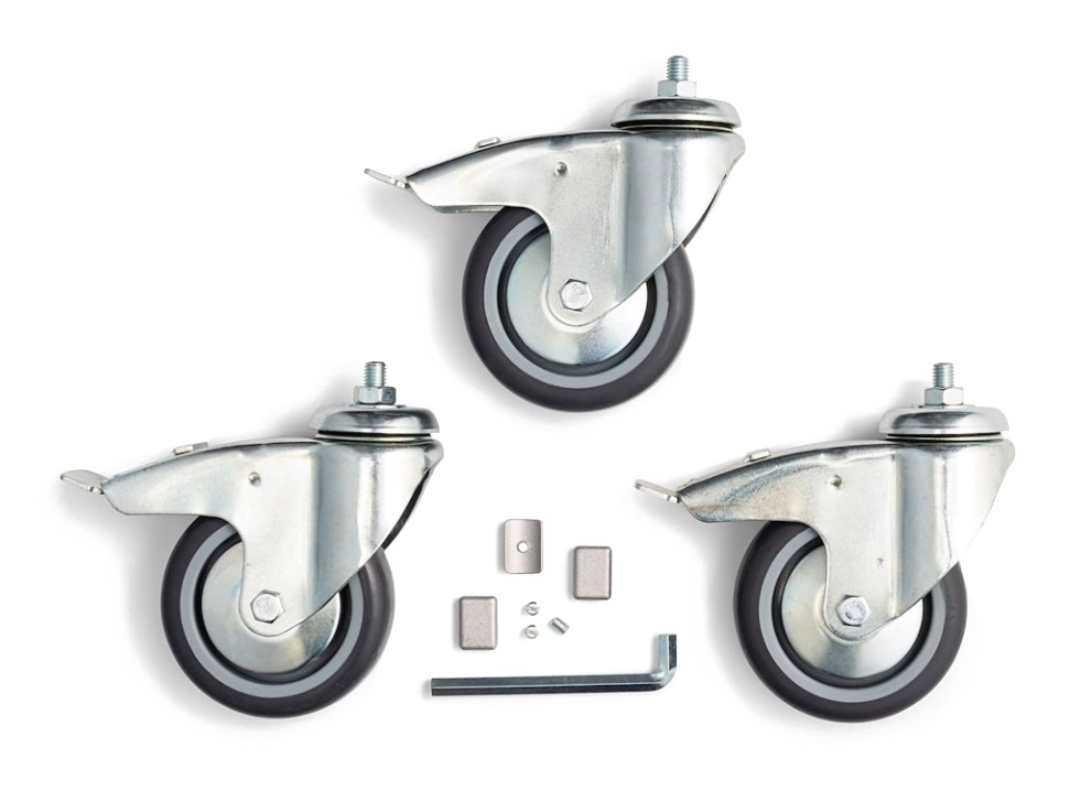 A set of three 100mm braked wheels with M10 screw top. The wheels are able to support a maximum weight of 100kg.