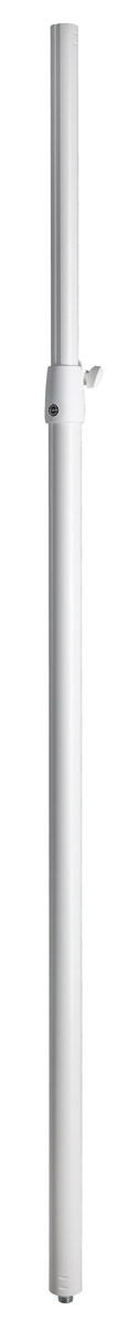 A telescopic speaker pole with spring-loaded socking screw and M20 thread connector. Available in black or white finish. Height can be adjusted from 945mm to 1,475mm. Weight is 2.54kg