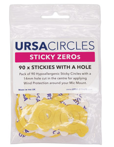 URSA Sticky ZEROs are round adhesive tapes with a diameter of 24mm and pre-cut 14mm diameter hole. They have been designed for compatibility with various microphone mounts including DPA Concealers and URSA MiniMounts. A small peel-off tab enables 'easy and fast' application. These transparent adhesive circles have a low profile of 0.4mm and are hypoallergenic and safe to use directly on the skin or fabrics. URSA suggest the tapes 'won’t leave any residue and can be peeled off without tearing'.