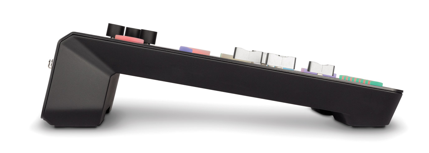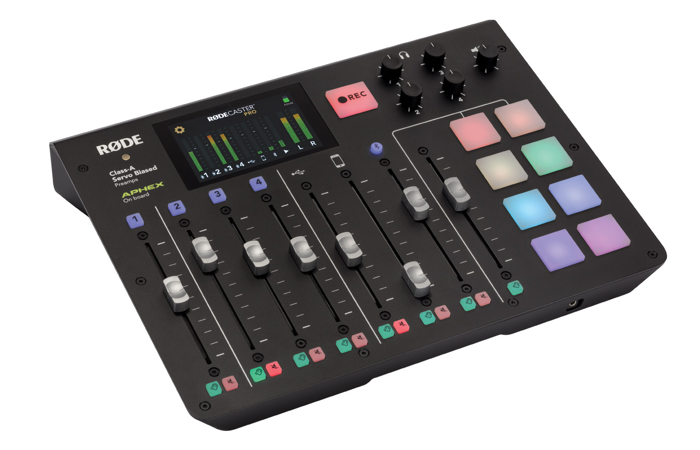 The main panel of the production studio houses a 5.5-inch, high-definition touchscreen with haptic feedback. From this screen the user is able to monitor inputs, outputs, active DSP, timeline, and scroll/select menus to set up. A rotary encoder aids menu navigation and control. Nine channels, including six physical faders and three virtual faders can be individually assigned, and eight SMART pads can be fully programmed to trigger sounds, voice effects, MIDI commands, and mixer actions. Four rotary controls allow the setup of headphone output level, and an illuminated ‘Rec’ button is ergonomically placed for access.