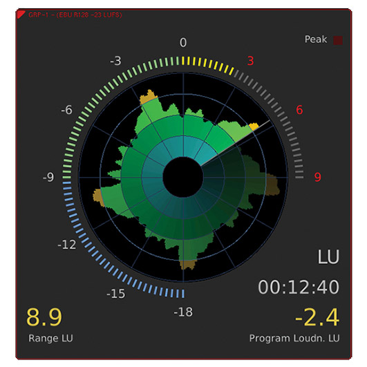 Radar instrument, developed by TC Electronic, is a high-resolution display of momentary loudness and loudness history in a single, unique Radar view. The circular, colour-coded display makes it easy to balance audio visually and to see when level falls below or exceeds the end-listener's loudness range tolerance. The moving outer ring of the instrument represents the Momentary loudness value changing its colour when passing the Target Level. The area inside of this ring showing concentric circles is called Radar view and represents the Short-term loudness history (1 minute to 24 hours). The thicker circle represents the Target Level, its outer part shows exceedings, the inner part shortfalls. The radar is complemented by a true-peak warning and by two descriptors to characterize the entire loudness ‘landscape’ of a program, film or music track precisely. By default, the numbers displayed are program loudness and loudness range.