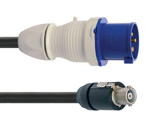These cables use Neutrik Powercon NAC3FC-HC 32A connectors supplied unterminated, terminated to Duraplug UK 13A plugs or Walther industrial splash proof plugs (BS EN 60309 -1:1999, formerly BS4343).