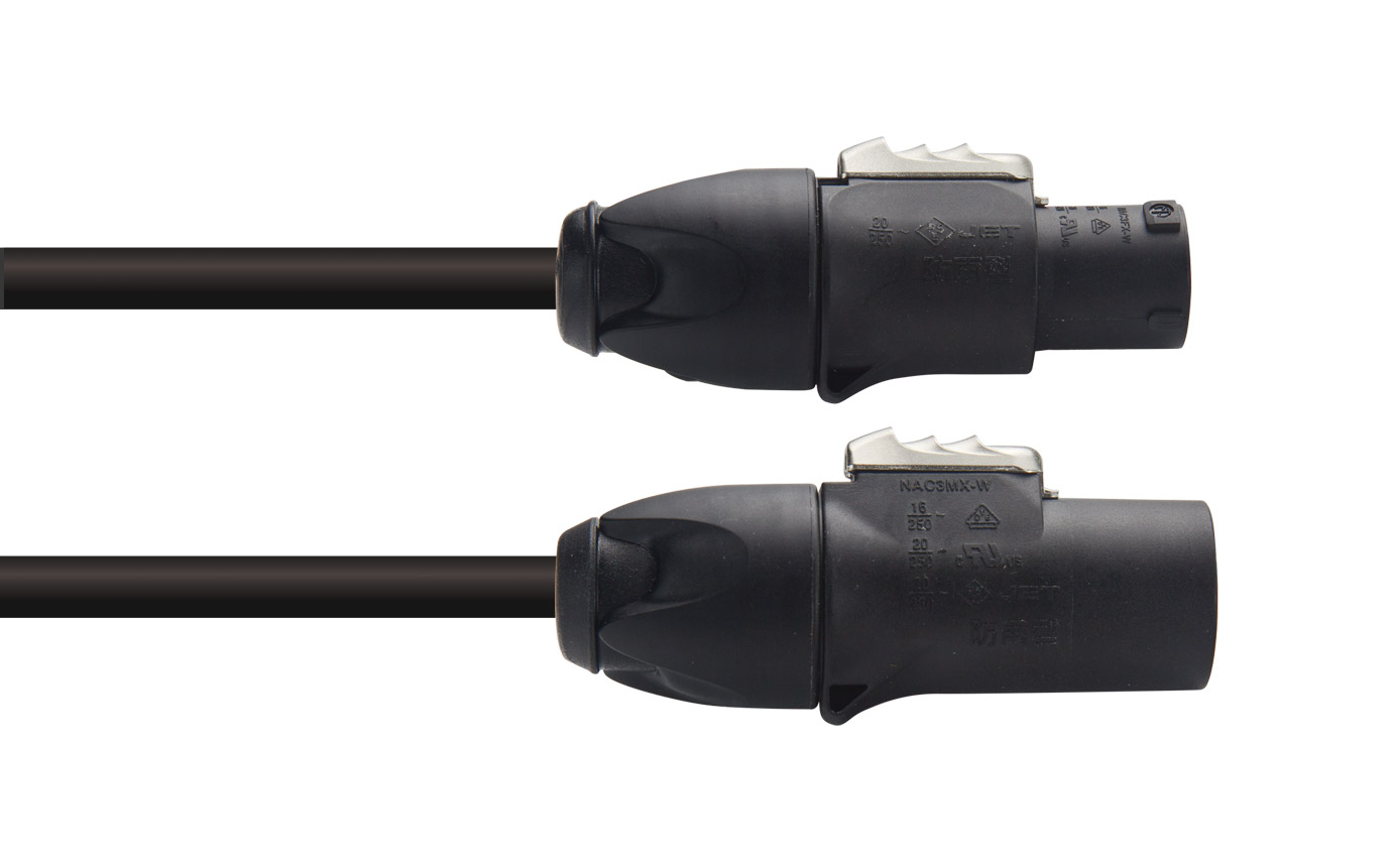 Neutrik Powercon TRUE1 NAC3FX-W-TOP 16 Amp connectors terminated to Neutrik Powercon TRUE1 NAC3MX-W-TOP 16 Amp connectors. All types use 20 Amp, 3 x 2.5sq.mm black cable with either PVC flexible or TRS (heat resisting rubber) jacket.