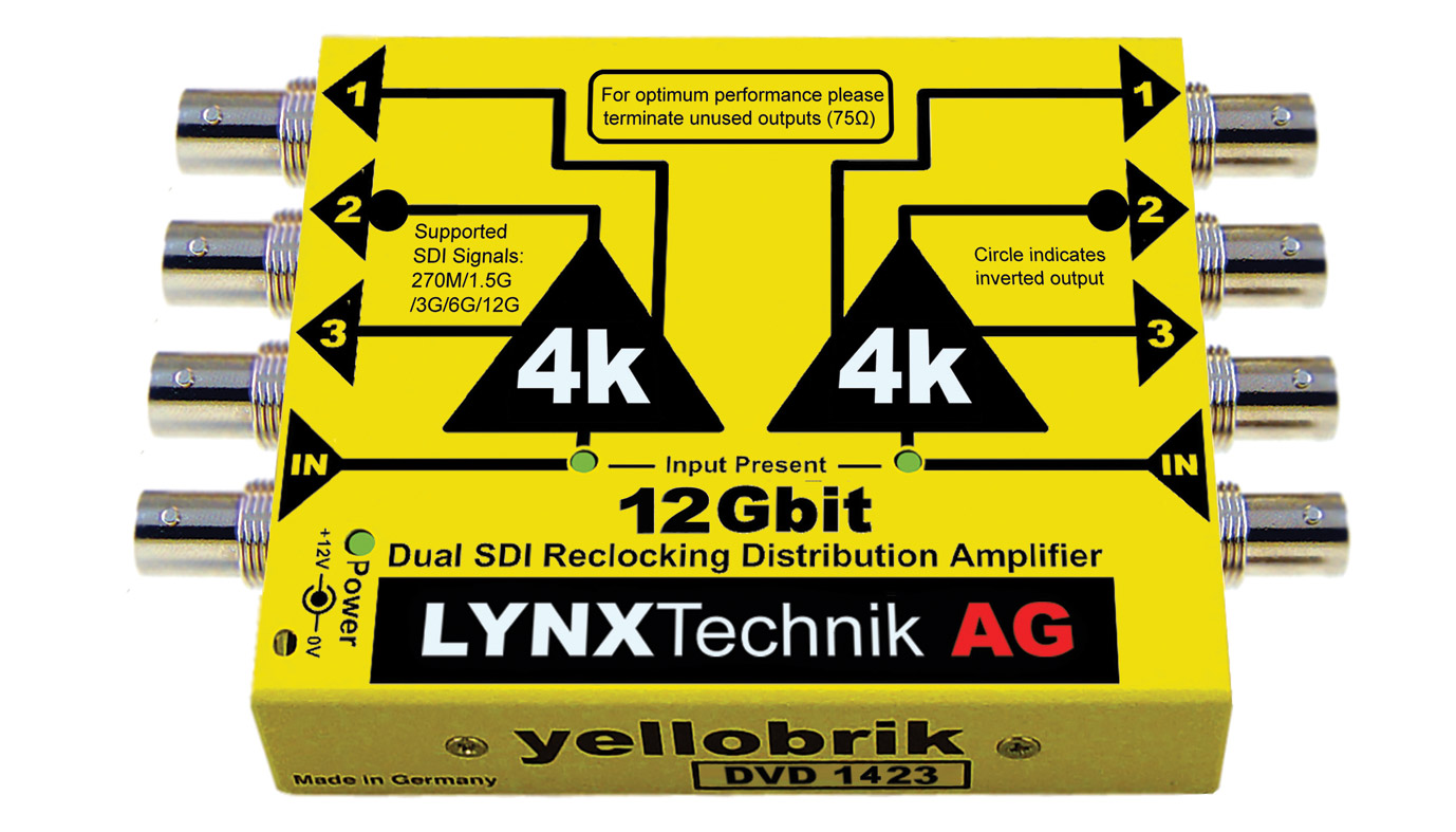 LYNX YELLOBRIK DVD 1423 DISTRIBUTION AMPLIFIER Video, dual 1>3, 12G-4K UHD/6G/3G/1.5G/SD-SDI Artikelnummer: 90-3019