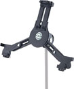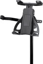 This model accommodate a variety of tablets with differing height, width, and depths. The holder is compatible with devices 5-11mm deep; 163-242mm high; 102-189mm wide, making it compatible with devices such as Apple iPad, iPad 9.7, iPad Pro, Amazon Fire HDX 8.9, Google Nexus 9, and others of similar dimensions. On first use, the size range can be adjusted before clamp screws set the positions. Subsequent mounting and un-mounting can be done quickly using a snap lock. A wing nut on the rear of the bracket adjusts the angle at which the tablet is displayed; portrait or landscape positions can also be set. A standard 3/8-inch thread connects to microphone stands and accessories. Weight: 0.36kg.