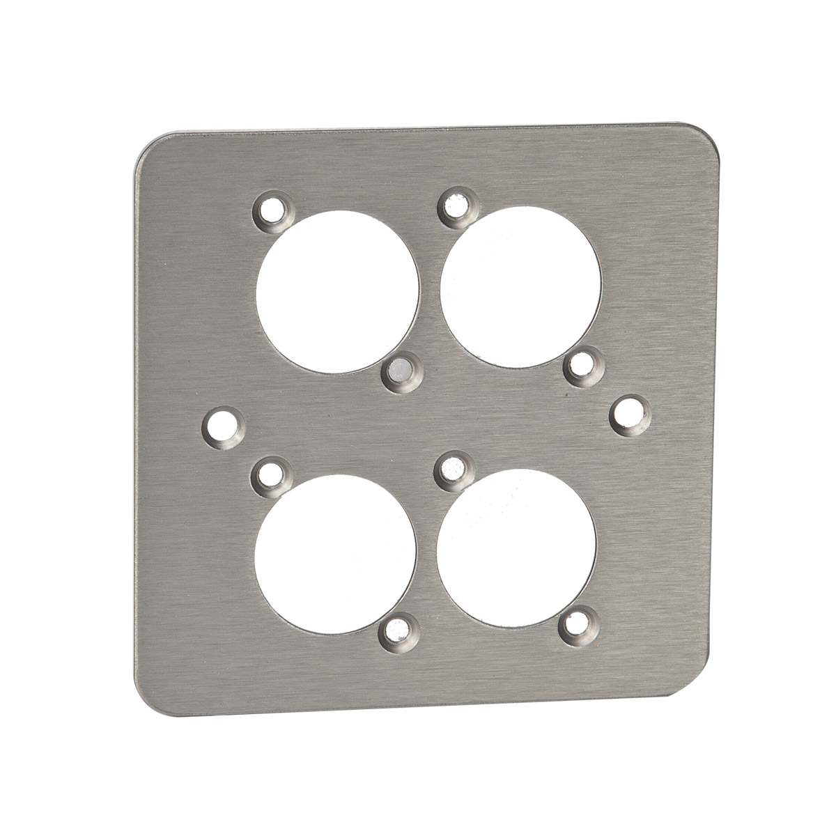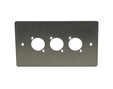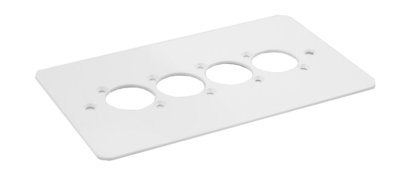 A large range of plates designed to fit BS4662 and BS1363 standard electrical flush or surface boxes. Plates are supplied with mounting holes for 1, 2, 3, 4, 6 or 8 connectors in the Canford “Universal” or Neutrik “D” series (24mm mounting hole), or blank for other punching by the user. Plate fixing screws plus appropriate connector mounting hardware is included. Connectors should be ordered separately as required. Note that due to the size of the mating connector, Neutrik NL4MP connectors should not be used in adjacent holes in F2 and F4 size plates).