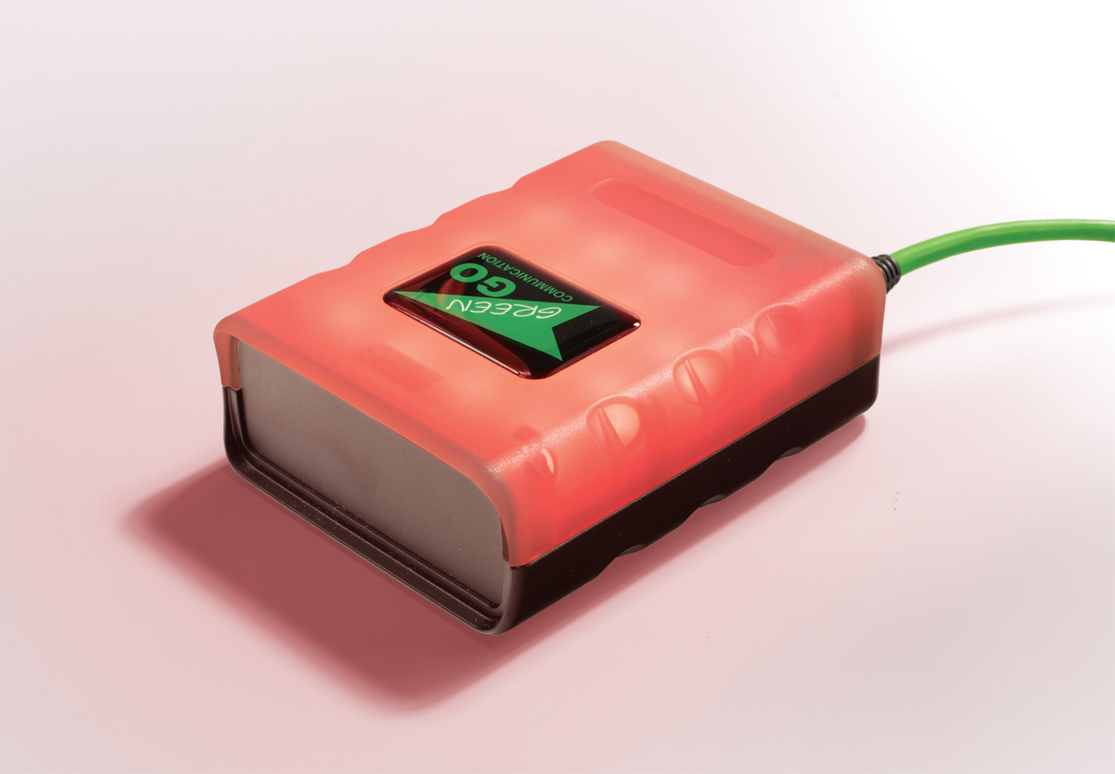 The Green-GO Beacon is a call indicator. It has a transparent casing and bright interior LEDs that will emit a flashing signal when receiving a call. It communicates over the network with other Green-Go intercom stations, where each station is connected to a network switch using standard Ethernet cabling.