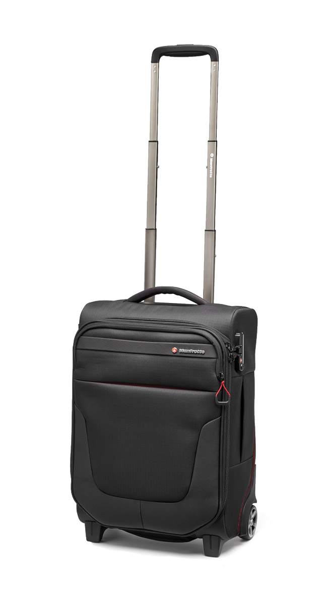 The main compartment zip can be locked using the fixed, TSA approved, combination lock, and the overall dimensions of the case ensure it falls within most domestic airline carry-on allowance dimensions. The standard wheels can be replaced with compatible wheels, such as some roller-blade type wheels, by the user. A four-stage extending handle, stored in the rear of the case, can be lengthened to suit, for pulling. A tripod can be carried externally, with a securing strap and foot pocket on the side of the case.