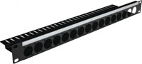 Multifunktionales Economy-Anschlussfeld, 1 HE, 16 Ausschnitte, mit Halterung für einen Papierbeschriftungsstreifen mit einrastender Abdeckung und eine Führungsleiste zur Verlegung…
