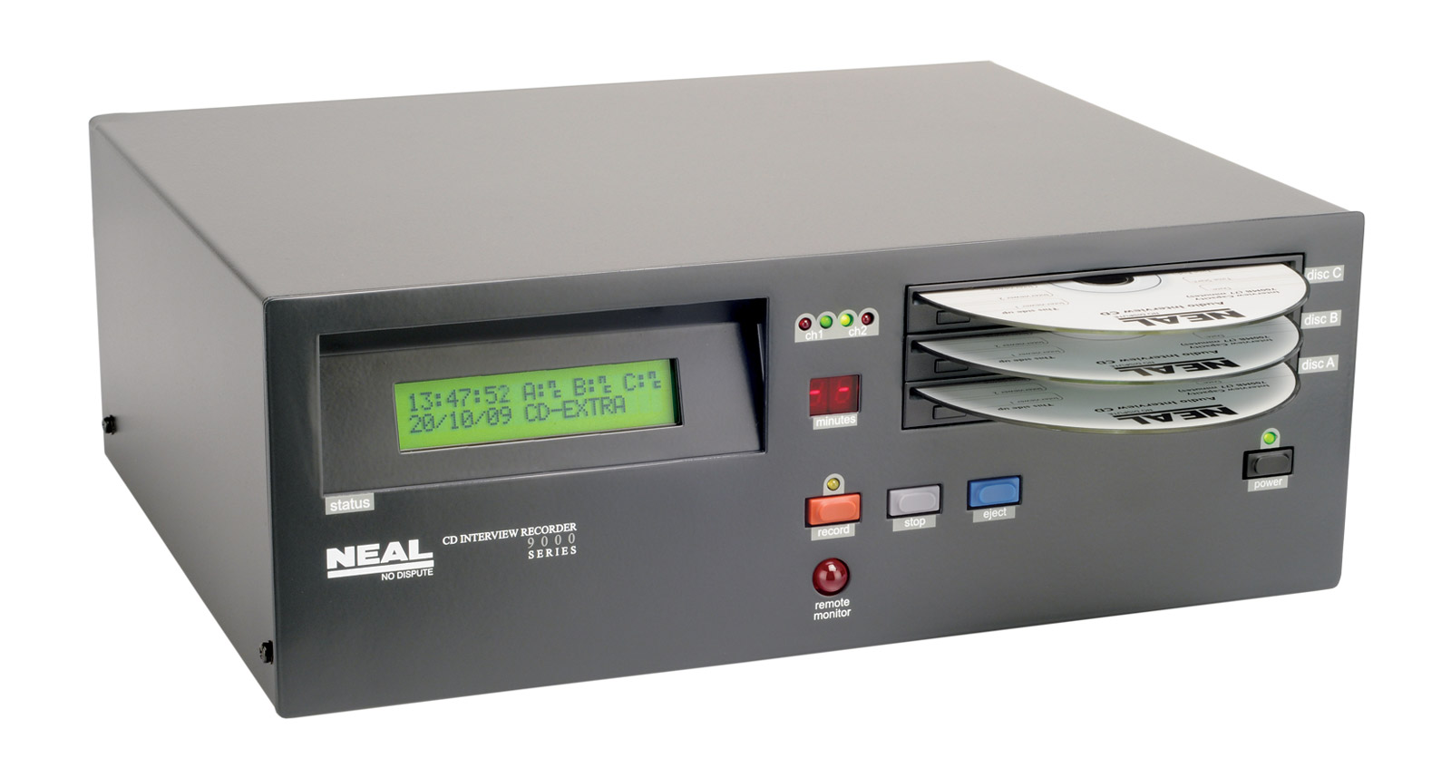 NEAL 9102 DESKTOP DUAL CD INTERVIEW RECORDER With microphonesNEAL 9103 DESKTOP TRIPLE CD INTERVIEW RECORDER With microphonesNEAL Boundary layer microphone for use with fixed location 9000 series recorders (5 metre cable)NEAL 9000 Series Desk Mounting Brackets (For S/N 190400 onwards)NEAL 9000 Series Desk Mounting Brackets (For S/N 190400 onwards)NEAL CB9XX2-3 CARRYING BAG For 2/3 Disc desktop digital interview recordersNEAL CB9XX2-3 CARRYING BAG For 2/3 Disc desktop digital interview recorders