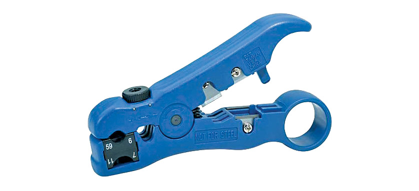 A combination cutter and stripper suitable for Cat5E/Cat6 twisted pair cables plus coax cables RG59, RG6 (CX100/CT100) and RG11 (CX167/CT167). The spring loaded jaws clamp securely onto the cable, and the tool is then rotated around the cable. The cutting blade depth for data cables is adjusted with a thumb screw. For coax, the blades are preset to 6.35mm for the two level strip that is required for most designs for F connectors.