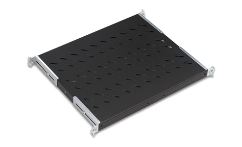 Universal 19-inch ventilated sliding shelves with adjustable mounting brackets. The brackets fix to slides on either side of the shelf which in turn fix to the inside face of the front and rear rack-mounting profiles. Each corner bracket has two folded-metal prongs, allowing the shelf to be fully positioned in the top and bottom U aperture before secured with a bolt through the middle U aperture. The shelf can then be pulled out of the rack. Fixings provided. Load capacity, for 600mm and 800mm is 30kg; for 1000mm version it is 50kg. Available in three depths and in a choice of grey, RAL 7035, or black, RAL 9005 finish.
