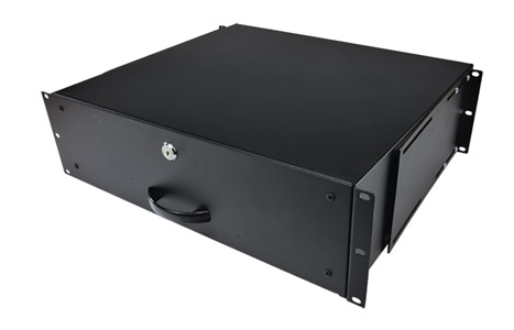 A welded steel drawer slides on telescopic slides mounted within a sleeve. When closed, the front of the drawer is flush with the rack-mounting brackets. A handle and cylinder lock are provided on the drawer-front. It has front and rear mounting angles, adjustable between 400 – 570mm with a drawer depth of 400mm.