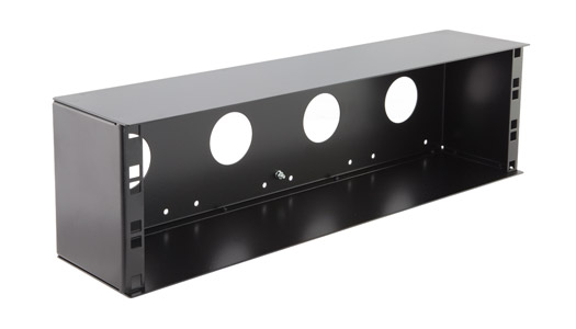 This range of boxes with integral rack-strips, punched in 1U increments, is suitable for wall mounting, fitting under workstations or virtually anywhere where connection panels or rack-mounting equipment needs to be located. They are constructed from 1.5mm steel in 2U, 3U, 4U, 6U, 8U, 12U and 20U heights and two depths in full-rack and half-rack widths.