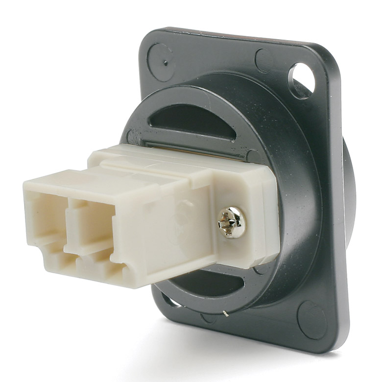 This range of fibre optic couplers or ‘feed-through’ connectors mounted on flanges fits the standard ‘XLR’ cut-out. Suitable for use on Canford Universal Connection Panels, connector plates, stageboxes, wall-boxes and any other application where an ‘XLR’, ‘Q-G’ or ‘D’ housing cut-out is available.
