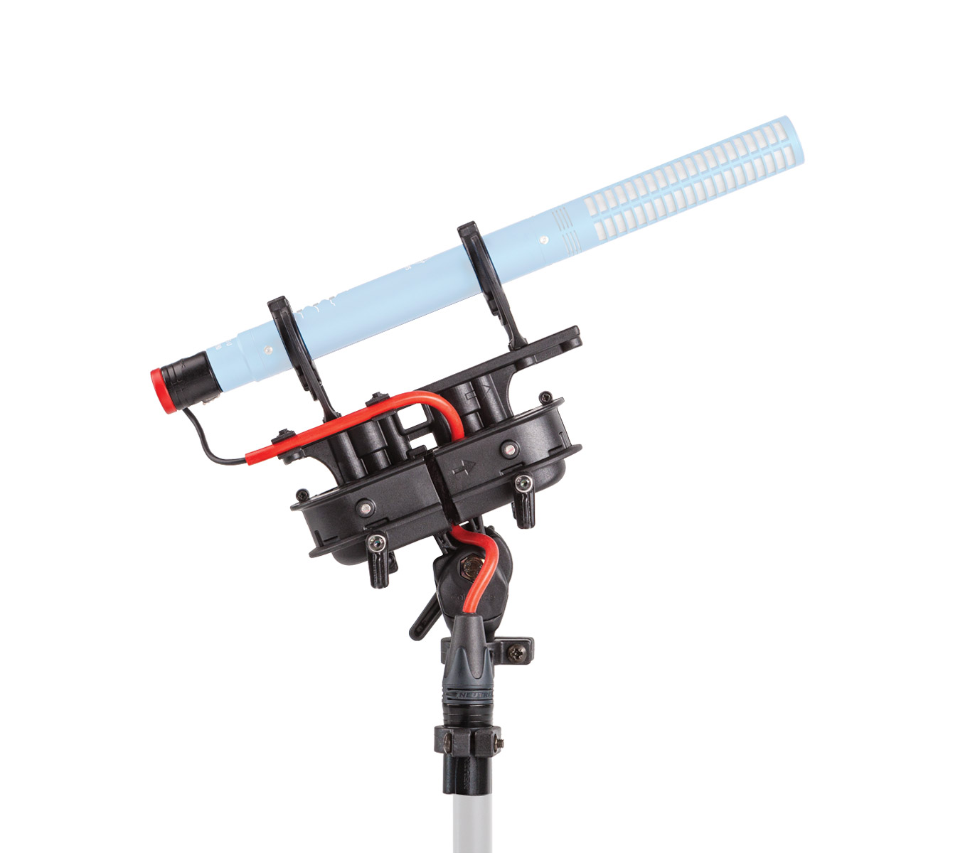 The microphone is carried in the patented Rycote soft suspension 'lyres', seen before on some of Rycote's later designs, to isolate it from vibration passed from the pole, stand or handle to which it is attached. The suspension is supplied with a short, ultra-soft microphone cable, to avoid these vibrations by-passing the lyres, ready-fitted to the angled XLR-holder below the suspension.
